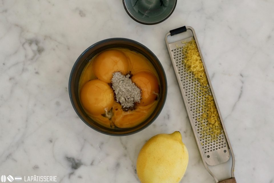 - 1 TL VanillezuckerNun das Eigelb zusammen mit dem Vanillezucker und dem Schalenabrieb einer Zitrone langsam unterlaufen lassen.