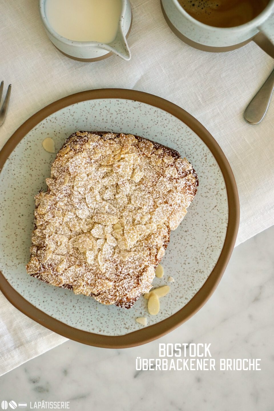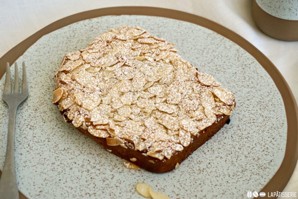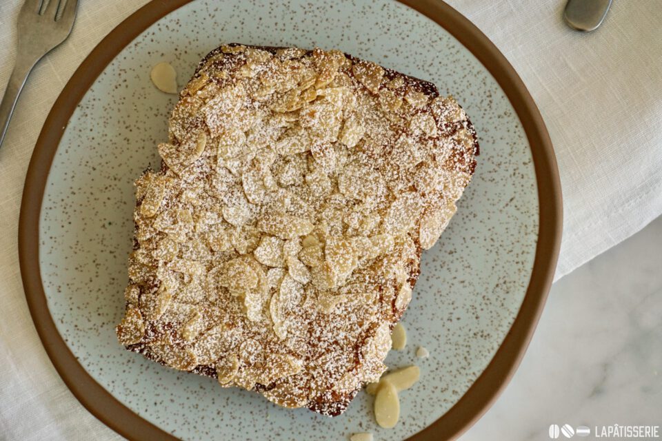 - Überbackener Brioche mit Mandelcreme, Orangensirup und gehobelten Mandel. Perfekt für den Frühstückstisch und als Resteverwertung.