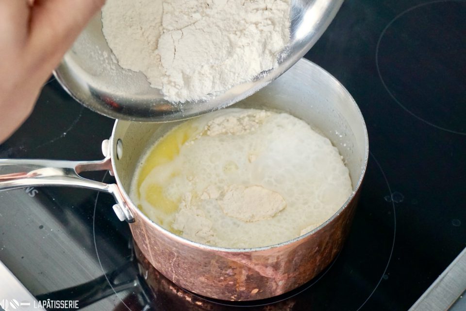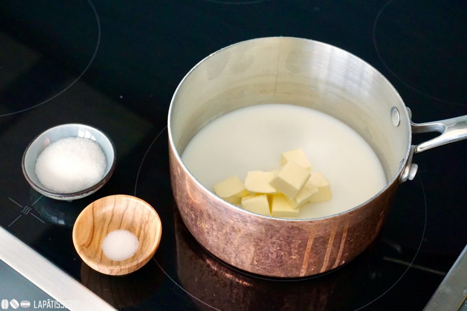 - 50 g Wasser | 50 g Milch | 3 g Salz | 15 g Zucker | 45 g ButterDen Backofen auf 200°C vorheizen. Zusätzlich eine kleine Metallschale mit etwas Wasser in den Ofen stellen.Das Wasser und die Milch zusammen mit dem Salz, dem Zucker und der Butter aufkochen.