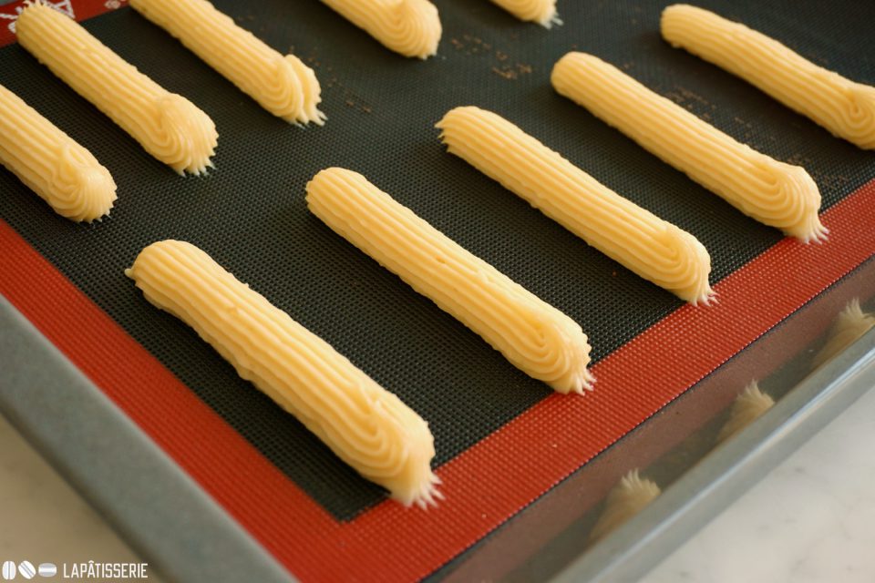 - Die Brandmasse in einen Spritzbeutel mit Lochtülle füllen. Auf einem Backblech mit Backpapier Streifen in der gewünschten Länge aufdressieren (hier: ca. 10cm lang und 1cm breit).Die Brandmasse geht beim Backen stark auf, deshalb immer etwas Abstand zwischen den Eclairs lassen.