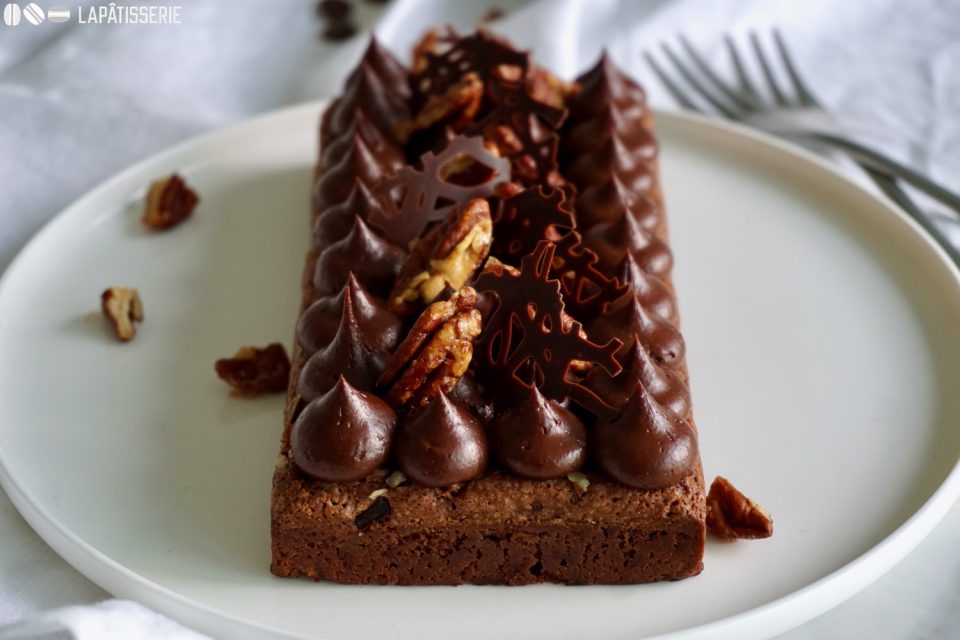- einige Pekannüsse, karamellisiertDie dunkle Ganache in einen Spritzbeutel mit Lochtülle füllen und einige Tupfen dicht an auf dem Brownie setzen.Zuletzt einige karamellisierte Pekannüsse und einige dünne Stücke Schokolade auf dem Brownie verteilen.