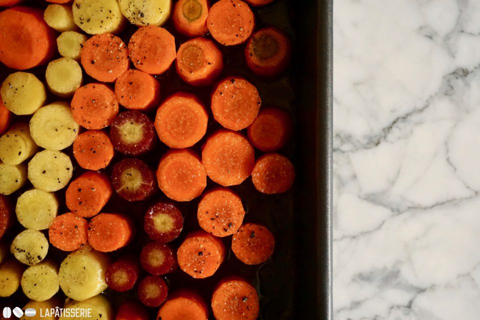 - 1 kg bunte MöhrenDie Möhren schälen und in dünne Scheiben (ca. 0,5cm) schneiden. Die Möhren nun in die Pfanne geben und mit etwas Öl anbraten. Sobald die Karotten gegart sind die Pfanne vom Herd nehmen.Die Hälfte der Karotten auf der Quiche verteilen und alles leicht andrücken. Die andere Hälfte gleichmäßig mit der Schnittfläche nach oben auflegen.