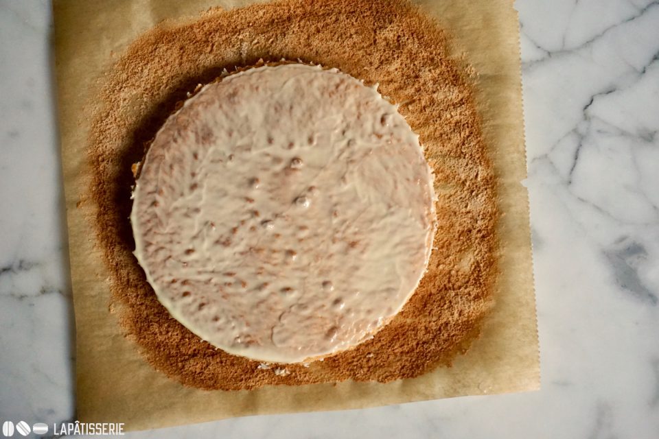 - 60 g gemahlene Mandeln, blanchiertGemahlenen Mandeln unterheben und die Masse auf einem Bogen Backpapier geben und zu einem Kreis mit ca. 14cm Durchmesser verstreichen. Den Dacquoise für ca. 10 Minuten bei 180°C backen.