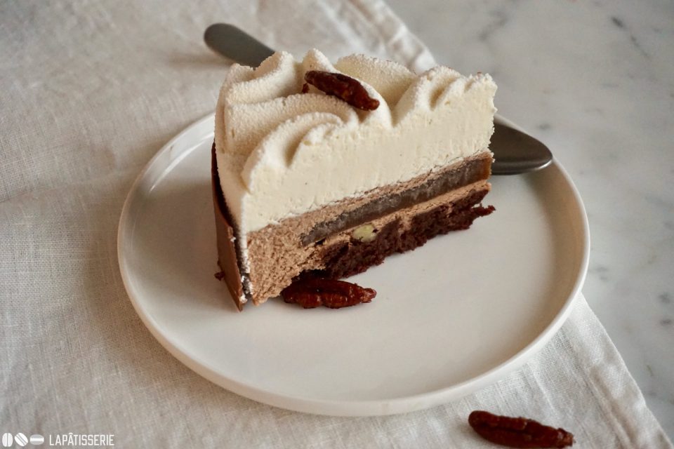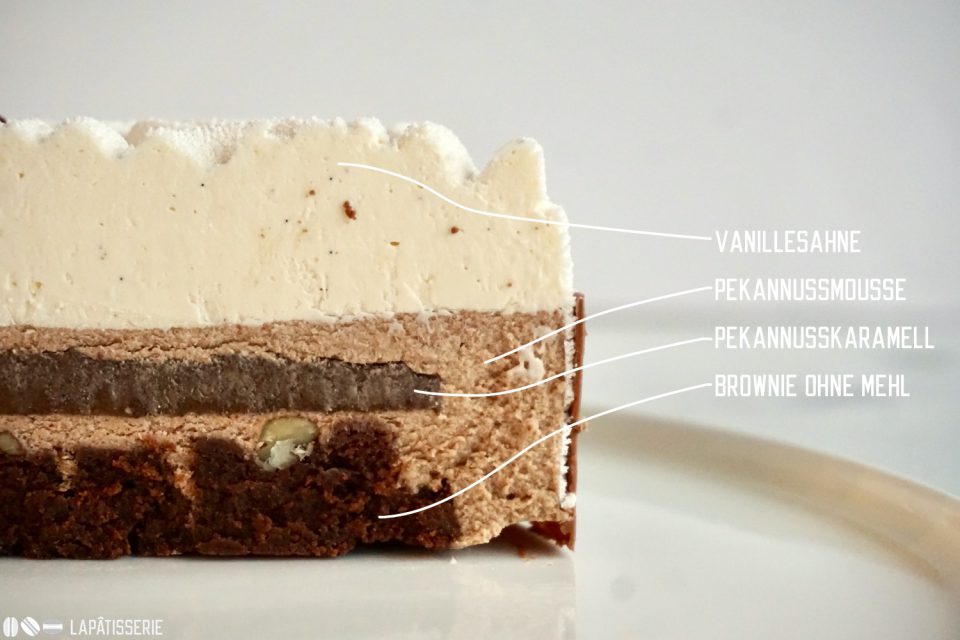 - Winterliches Entremet mit Pekannusskaramell, Pekannussmousse, glutenfreien Brownie und Vanillesahne.