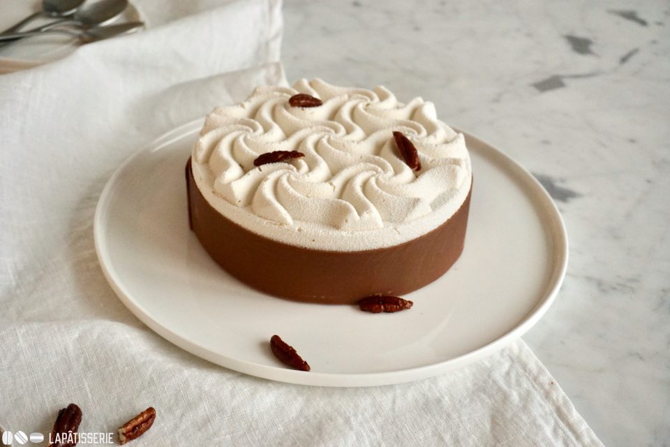Heute hab ich das Rezept für eine Torte mit Pekannussmousse, Vanillemousse und einem Kern aus Pekannusspraliné.