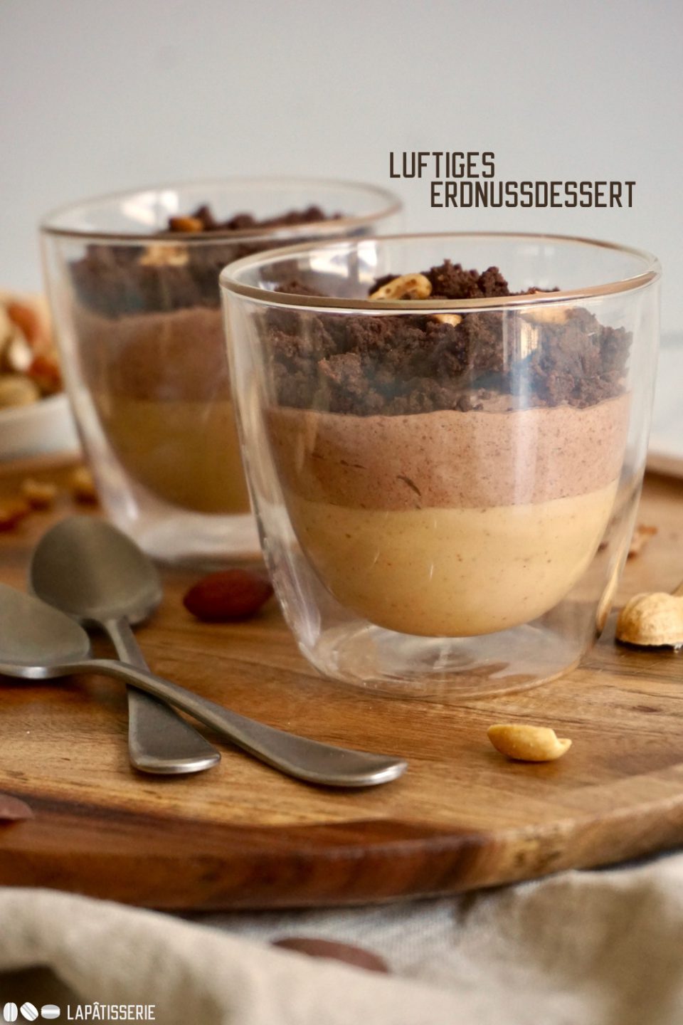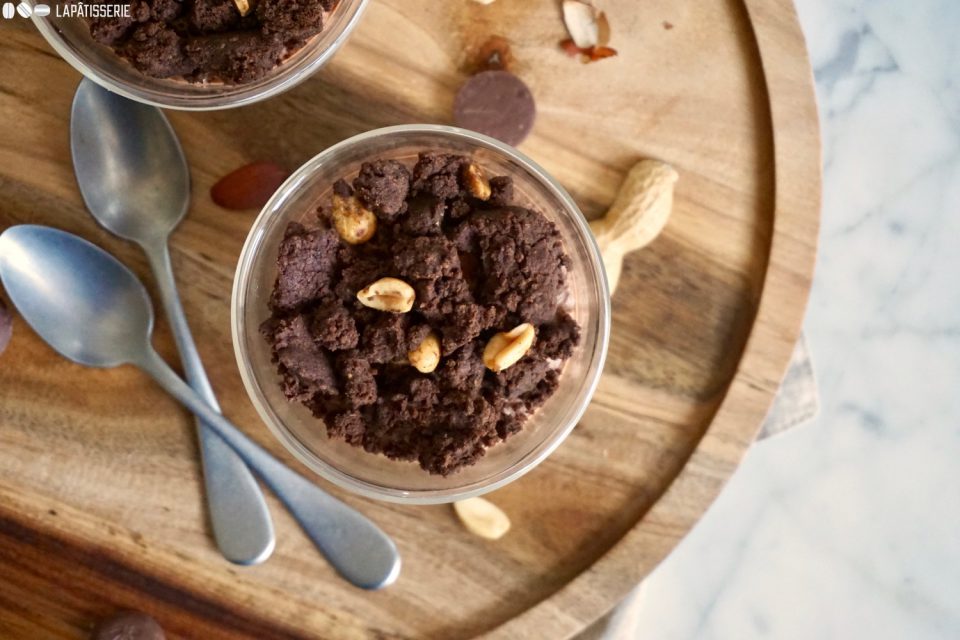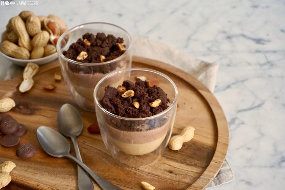 Heute gibt’s ein luftiges leichtes Dessert im Glas mit Erdnussmousse, Mousse au chocolat und Erdnussstreuseln.