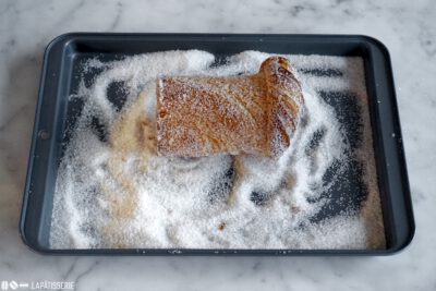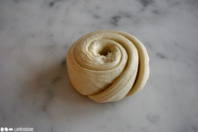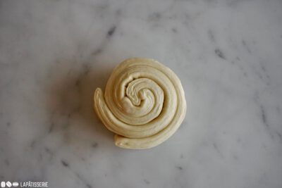 - Die losen Enden unter den Cruffin formen. Den Cruffin auf die Arbeitsfläche legen und mit dem Finger ein Loch in die Mitte des Cruffins drücken.