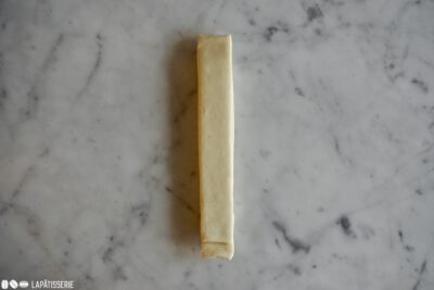 - Den Hefeteig nun mit gleichmäßigem Druck rechteckig (ca. 30x12cm) ausrollen. Den Hefeteig nun falten. Hierfür den ausgerollten Hefeteig imaginär in drei gleiche Stücke teilen. Das untere Drittel auf das mittlere Drittel falten. Zuletzt das obere Drittel ebenfalls zur Mitte hin falten.Den Hefeteig abdecken und für 30 Minuten in den Kühlschrank stellen.