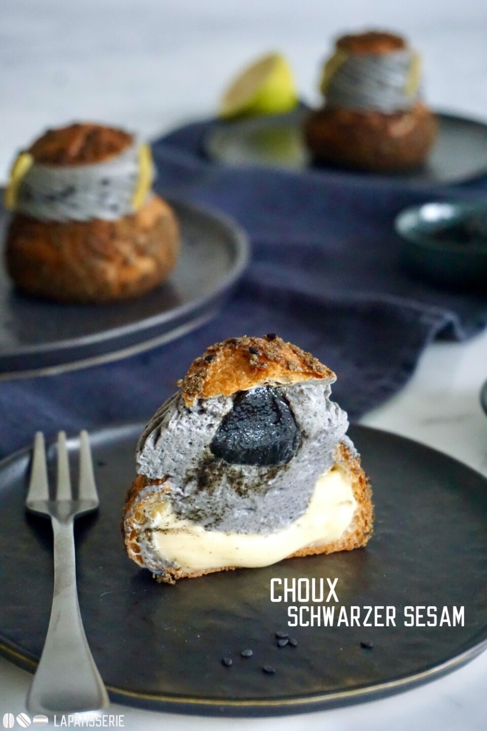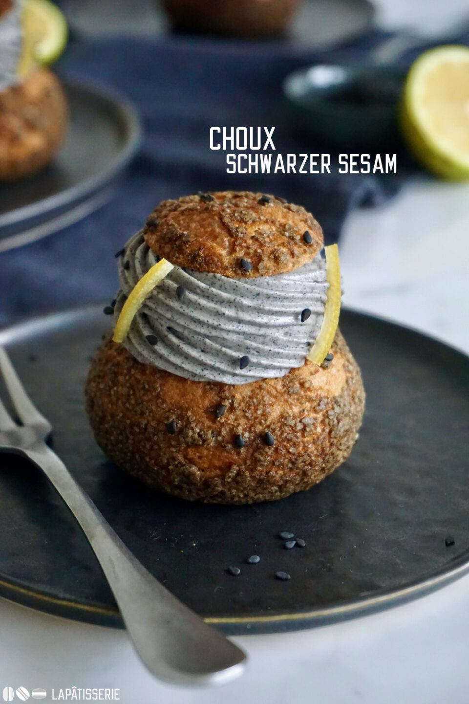 - Elegante Windbeutel gefüllt mit einer fruchtig-säuerlichen Zitronencreme, schwarzem Sesamkaramell und luftiger schwarzer Sesamcreme
