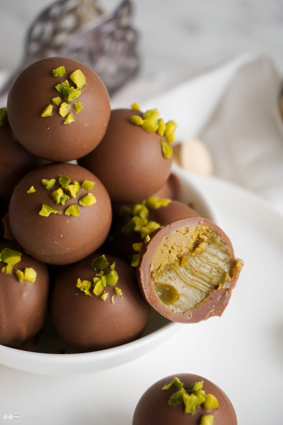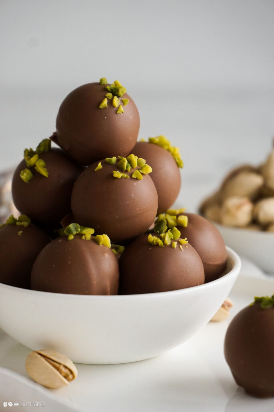 - Schokoladige Trüffel mit crunchy Pistazienschicht und cremiger Ganache aus weißer Schokolade und Pistazienmus