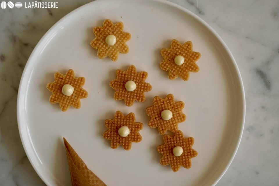 - 20 g weiße SchokoladeMithilfe eines Ausstechers kleine Blüten ausstechen. Die Blüten für ca. 7 Minuten backen. Im Anschluss vollständig abkühlen lassen.Die weiße Schokolade schmelzen und in einen kleinen Spritzbeutel füllen. Nun in die Mitte der Blüten einen kleinen Punkt garnieren. Die Schokolade im Kühlschrank fest werden lassen.