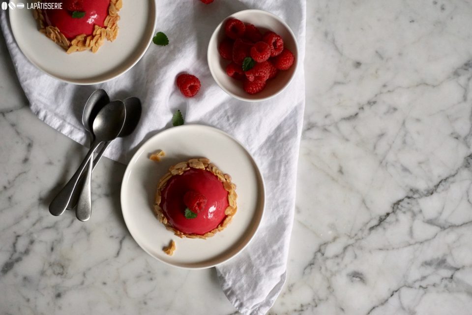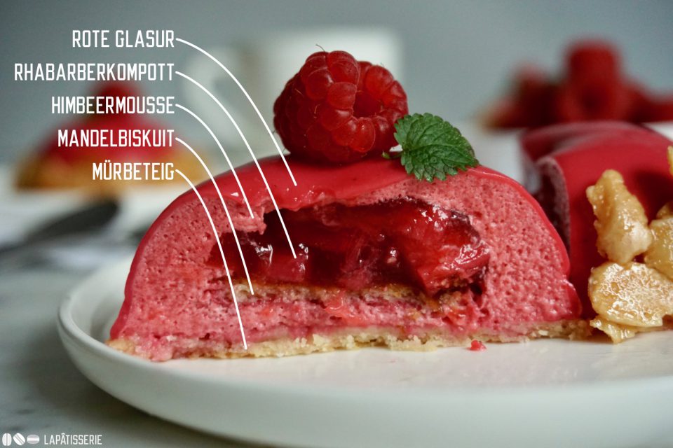 - Kleine Törtchen mit Rhabarberkompott, luftiger Himbeermousse und Mandelkrokant