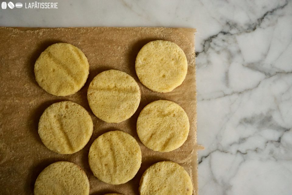 Nach dem Backen den Biskuit abkühlen lassen und 6 kleine Kreis (3cm) ausstechen. Die Biskuits leicht auf die Kerne drücken. Die Kerne für ca. 3 Stunden gefrieren.