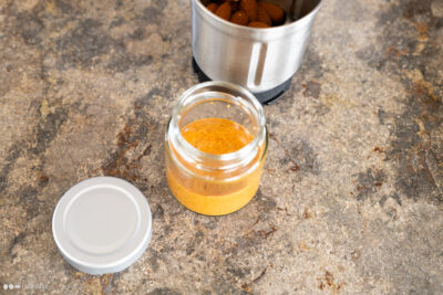 - 100 g Puderzucker | 100 g Mandeln, gemahlenGemahlene Mandeln mit Puderzucker in einen Multizerkleinerer. Nach Bedarf das Mandelmehl erneut sieben.Hinweis: Dieses Rezept funktioniert nicht mit teilentöltem Mandelmehl.