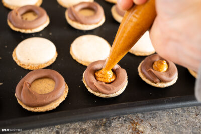 - Einen Ring Zimtganache auf eine Schale geben. Die Mitte mit Mandelpraliné auffüllen. Zweite Schale vorsichtig andrücken.Macarons mind. 1 Std., am besten über Nacht, im Kühlschrank durchziehen lassen.