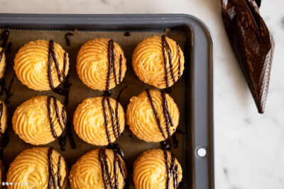 Klassisches Spritzgebäck mit Sauerkirschfüllung und dunkler Schokolade