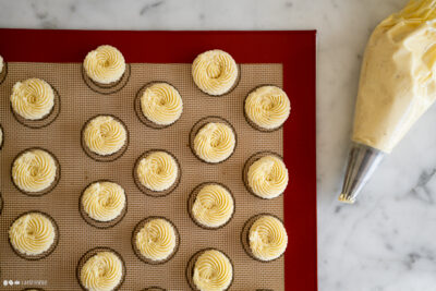 - 170 g Butter | 45 g Puderzucker | 1 Eigelb | 1 Prise SalzDie weiche Butter zusammen mit Puderzucker, Eigelb und Salz für ca. 5 Minuten luftig aufschlagen.
