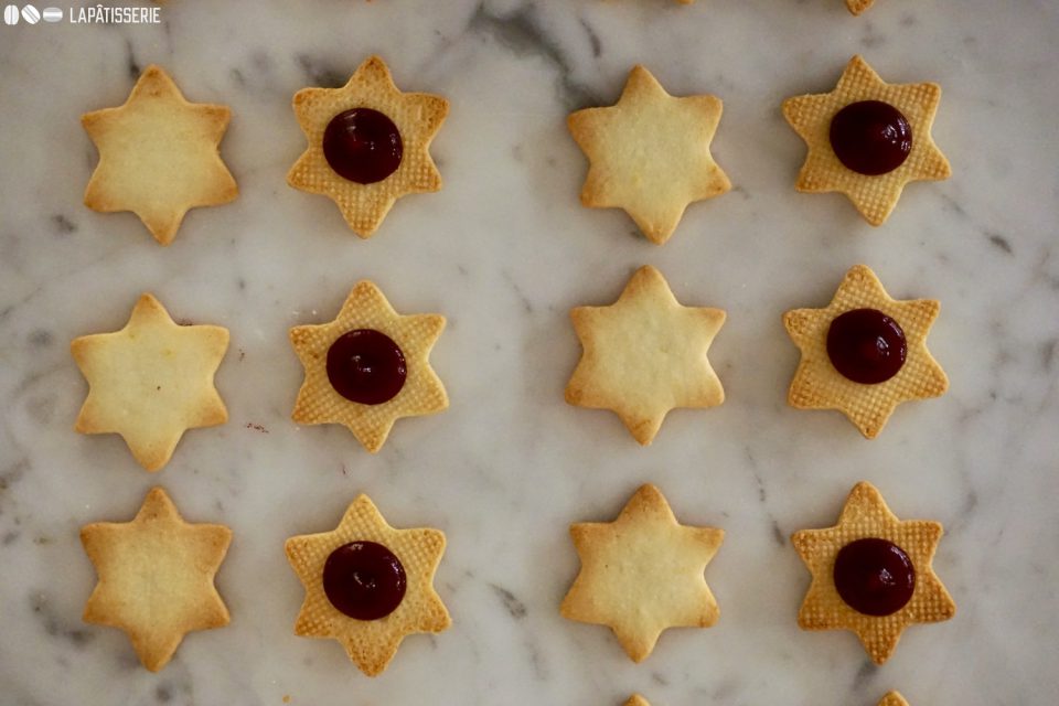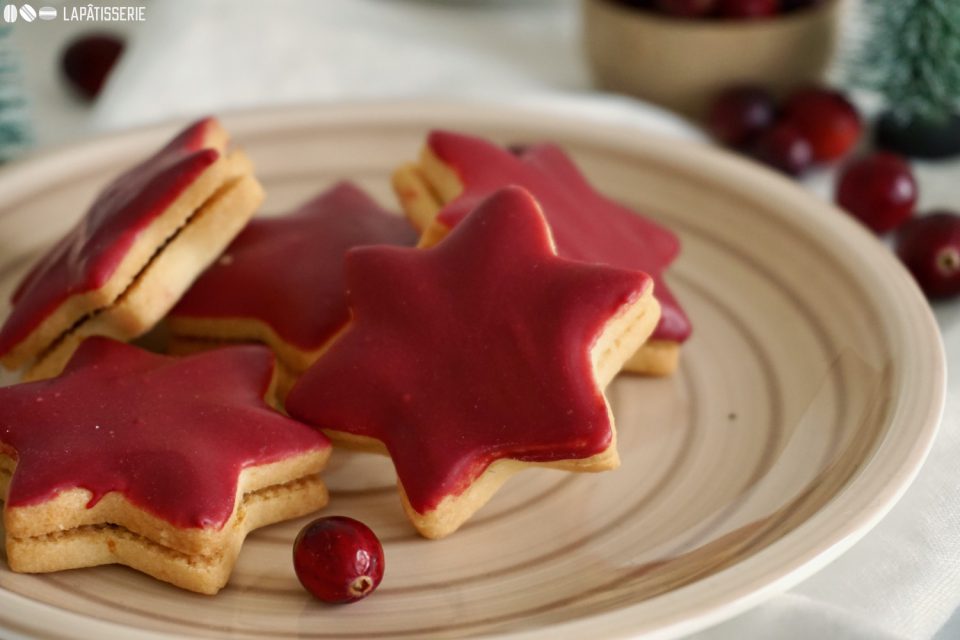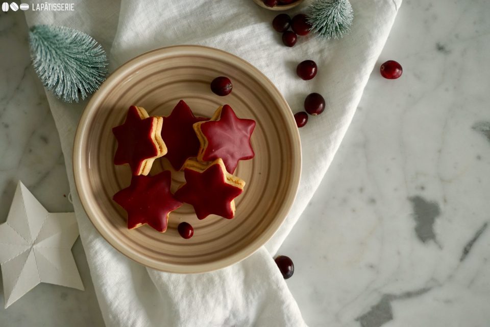 - Je einen kleinen Klecks Cranberrykonfitüre in die Mitte auf die Hälfte der Sterne geben. Die anderen Sterne auf die gefüllten Sterne legen und leicht andrücken.