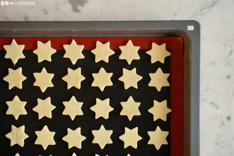 - Den Backofen auf 180°C vorheizen. Ein Backblech mit Backpapier auslegen. Nach der Ruhezeit den Mürbeteig auf der zwischen zwei Bögen Backpapier ca. 3mm dünn ausrollen.