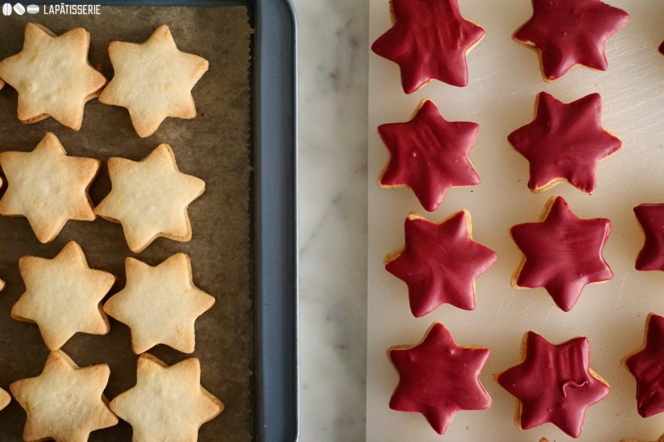 - Mit einem Ausstecher Sterne aus dem Mürbeteig ausstechen und mit etwas Abstand auf das Backblech legen. Den Teig solange ausrollen bis nichts mehr übrig ist (ggf. zwischendurch kühlen).Die Mandelkekse für 8 Minuten bei 180°C goldbraun backen. Die gebackenen Plätzchen abkühlen lassen.