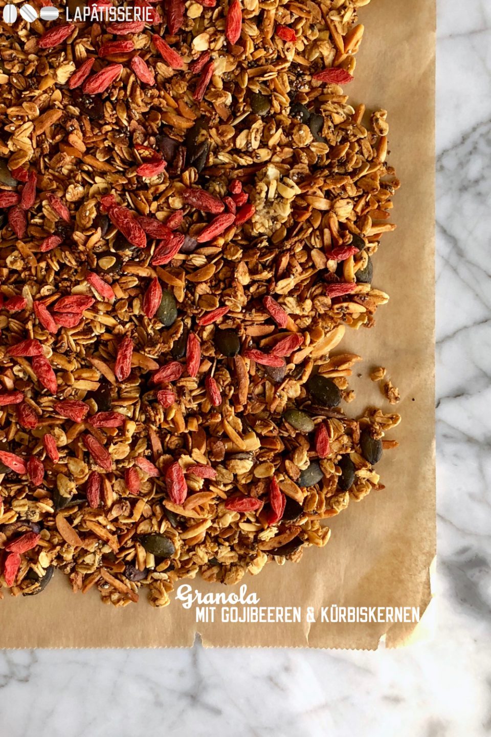 Heute hab ich ein ofengeröstetes Granola für euch mitgebracht mit getrockneten Gojibeeren und Kürbiskernen.