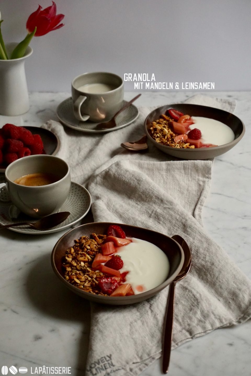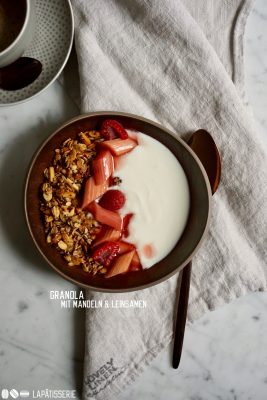Am heutigen Karsamstag gibt es ein neues Granola mit Mandeln, Leinsamen und mein geliebter Rhabarber ist zurück.