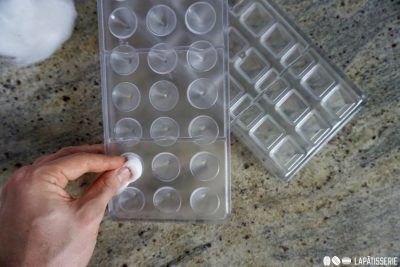 - Die Pralinenform mit Watte gründlich polieren, um Staub oder Kalkreste zu entfernen.Dieser Schritt sorgt später für glänzende Pralinen und erleichtert das Herauslösen.