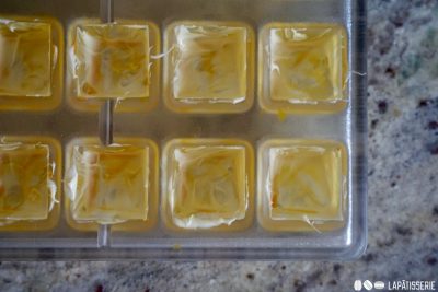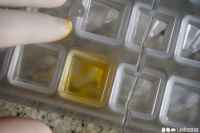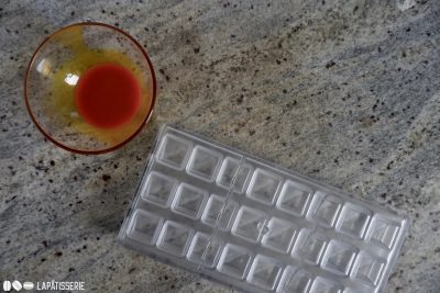 - weiße SchokoladeEine dünne Schicht temperierte weiße Schokolade über die feste Kakaobutter streichen, damit die Farben nach dem Ausgießen intensiver wirken.