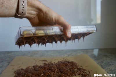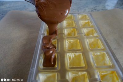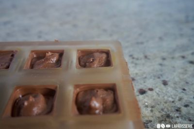 - dunkle SchokoladePralinenform randvoll mit temperierter Schokolade füllen.Form leicht klopfen, damit Luftblasen entweichen.