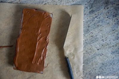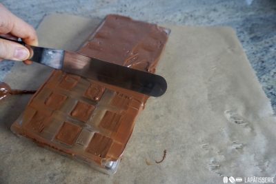 - dunkle SchokoladeTemperierte Schokolade auf die Form geben, gleichmäßig verstreichen und mit einer Winkelpalette sauber abziehen.
