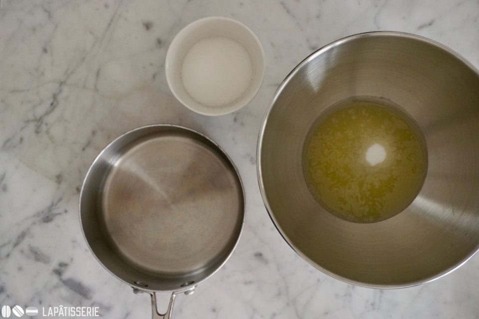 - 120 g Eiklar | 120 g Zucker | 30 g WasserNun das Eiklar zusammen mit dem halben Zucker in eine weitere Rührschüssel geben. In einen Topf das Wasser und den restlichen Zucker einwiegen.