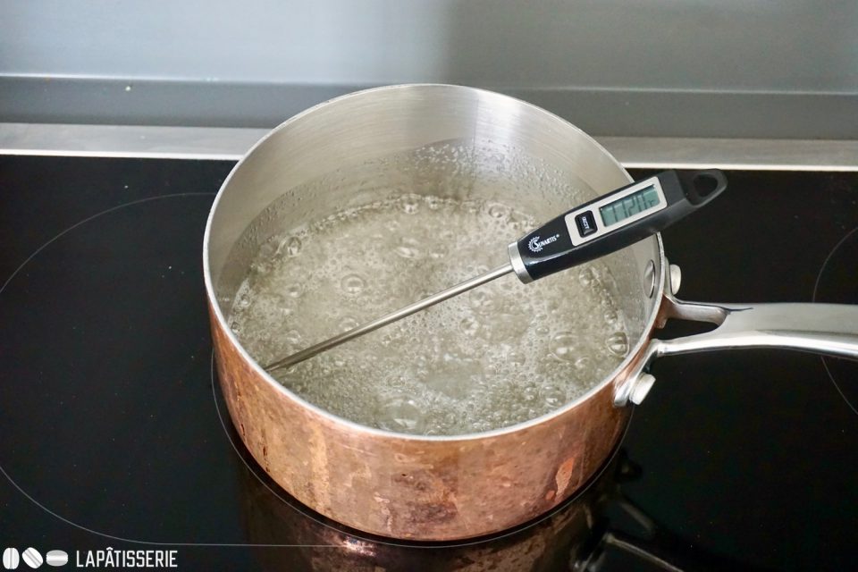 - Den Topf auf den Herd stellen und bei mittlerer Hitze den Zuckersirup zum Kochen bringen. Mithilfe eines Thermometers die Temperatur messen. Sobald das Thermometer 113°C anzeigt, das Eiweiß mithilfe der Rührmaschine auf höchster Stufe aufschlagen.
