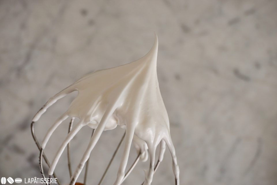 - Sobald der Eischnee an Volumen gewonnen hat und das Thermometer 117°C anzeigt, den kochenden Zuckersirup in einem dünnen Strahl in das Eiweiß laufen lassen.Den Eischnee so lange schlagen bis er Spitzen zieht und die Rührschüssel wieder Zimmertemperatur erreicht hat.