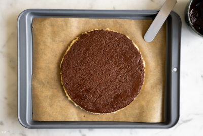 Biskuitmasse auf einen Bogen Backpapier verteilen und ca. 1cm dünn verstreichen.