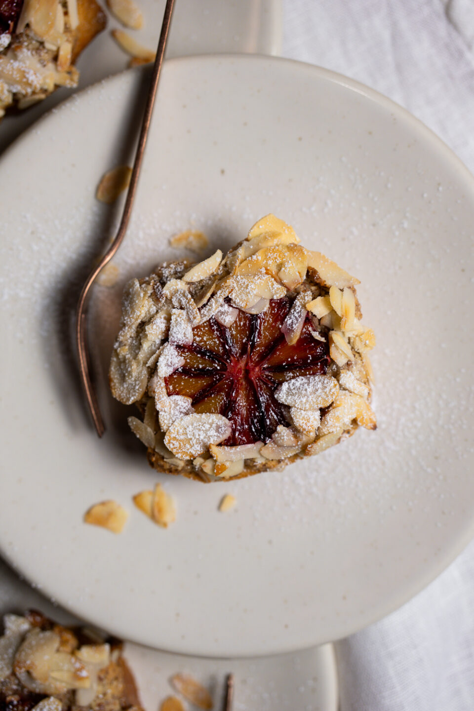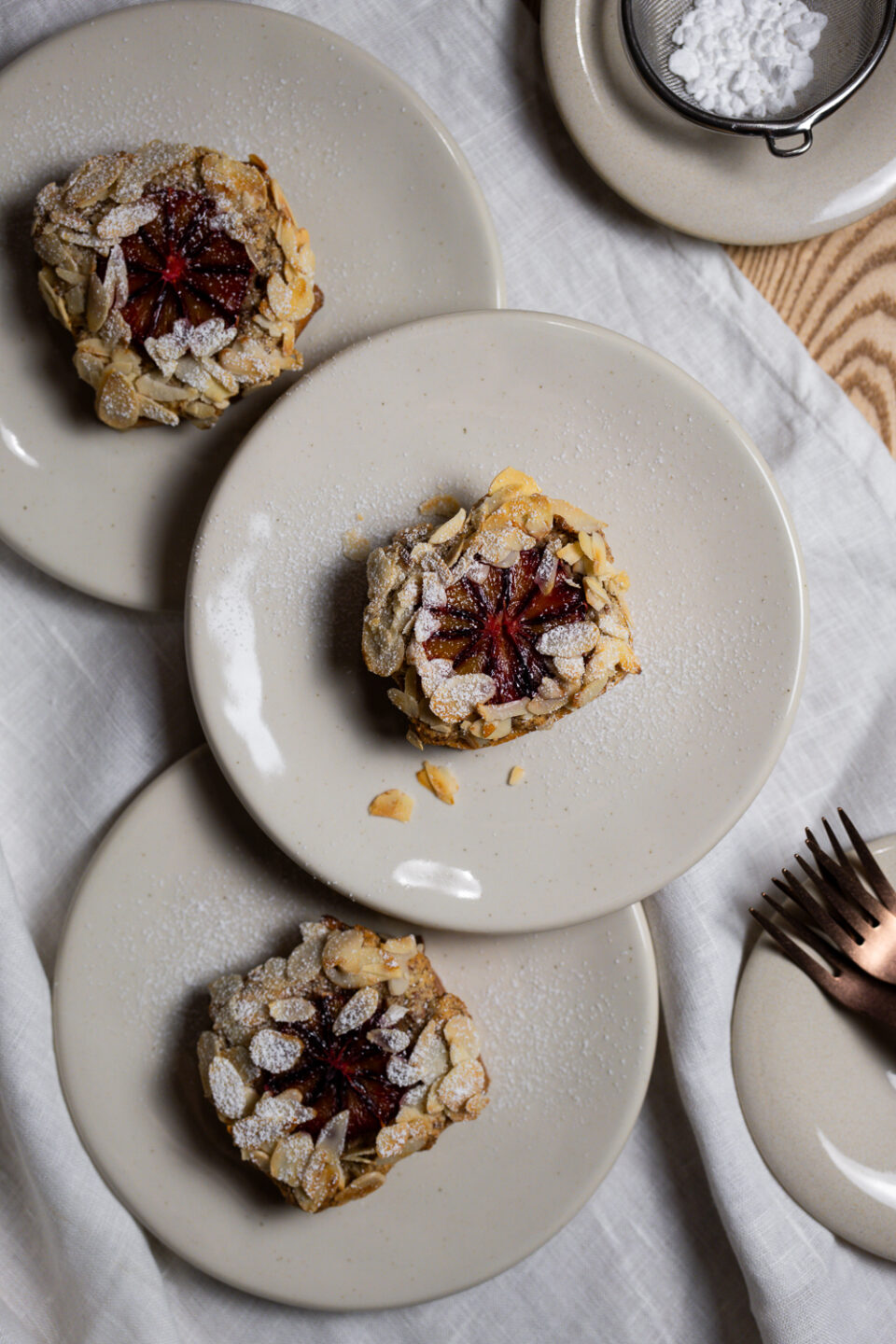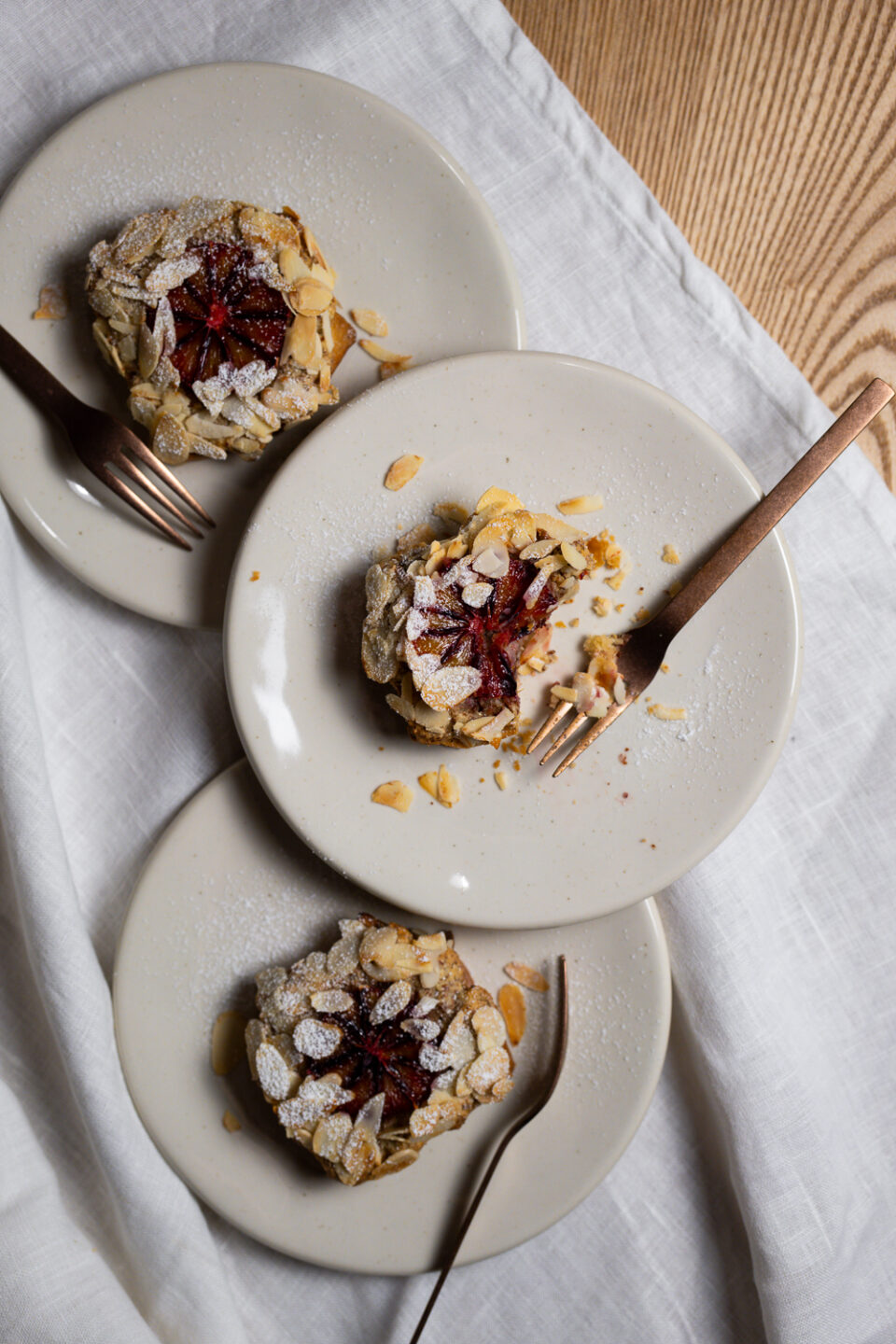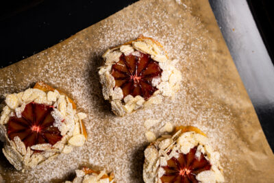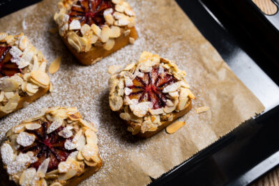 - Saftige Brioche mit Mandelcreme, Blutorangensirup, frischer Blutorange und gehobelten Mandeln.