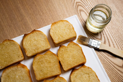 - 4 Scheiben BriocheBackofen auf 160°C Umluft vorheizen.Die Brioche-Scheiben auf ein mit Backpapier belegtes Blech legen und großzügig mit dem Orangensirup beträufeln oder bepinseln.