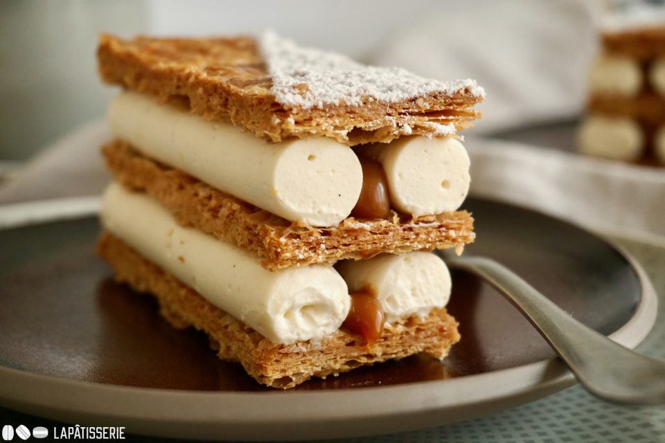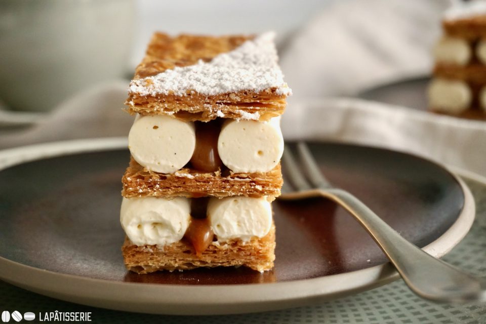 Heute habe ich ein Millefeuille mit karamellisierten Blätterteig, luftiger Vanillecreme und einem gesalzen Weichkaramell.