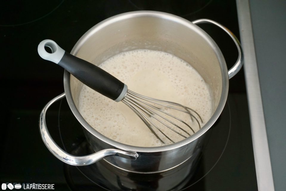 - 400 g Sahne | 1 Vanilleschote | 40 g Zucker | 1 Eigelb | 2 Blatt GelatineDie Gelatine in sehr kaltem Wasser einweichen. Die Sahne zusammen mit dem Zucker, dem Mark der Vanilleschote und der ausgekratzten Vanilleschote aufkochen.Sobald die Sahne aufgekocht ist, Topf vom Herd nehmen und die heiße Sahne langsam durch ein Sieb in die Schüssel mit dem Eigelb gießen. Das Eigelb zusammen mit der Vanillesahne verrühren. Die Mischung zurück in den Topf geben und alles auf ca. 85°C erhitzen bzw. bis die Creme beginnt leicht anzudicken.Nun die Creme vom Herd nehmen und die eingeweichte Gelatine einrühren. Die Creme in eine Box füllen, direkt mit Frischhaltefolie abfüllen und über Nacht im Kühlschrank erkalten lassen.