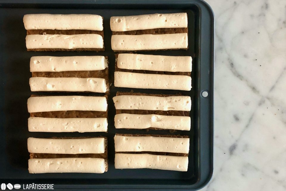 - Die Vanillecreme der Länge nach auf den Blätterteig dressieren (aufspritzen). In den mittleren Zwischenraum den Weichkaramell füllen.Den zweiten Blätterteig darauflegen und leicht andrücken. Den Vorgang mit der Vanillecreme wiederholen und anschließend eine letzte Lage Blätterteig auflegen und vorsichtig andrücken.