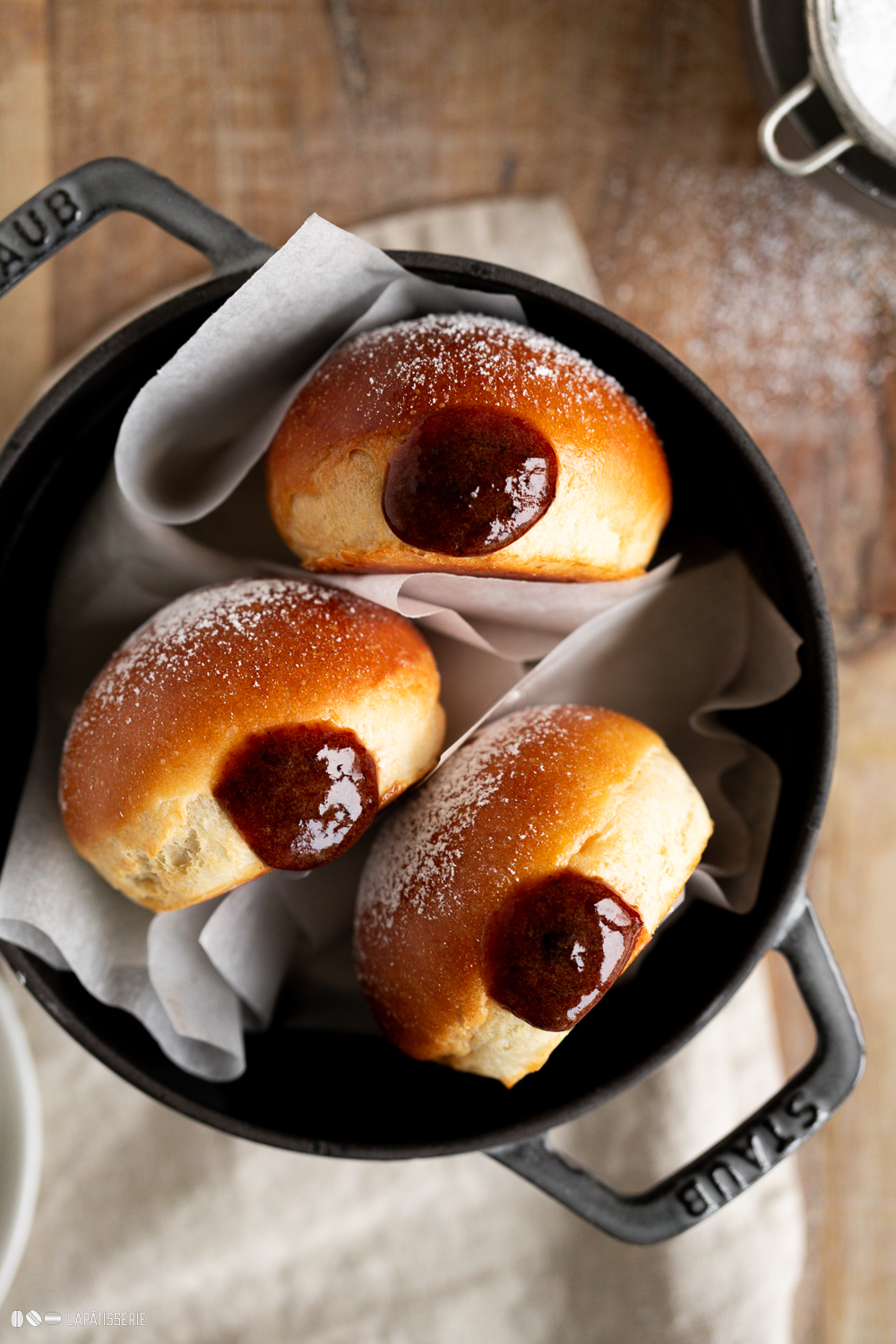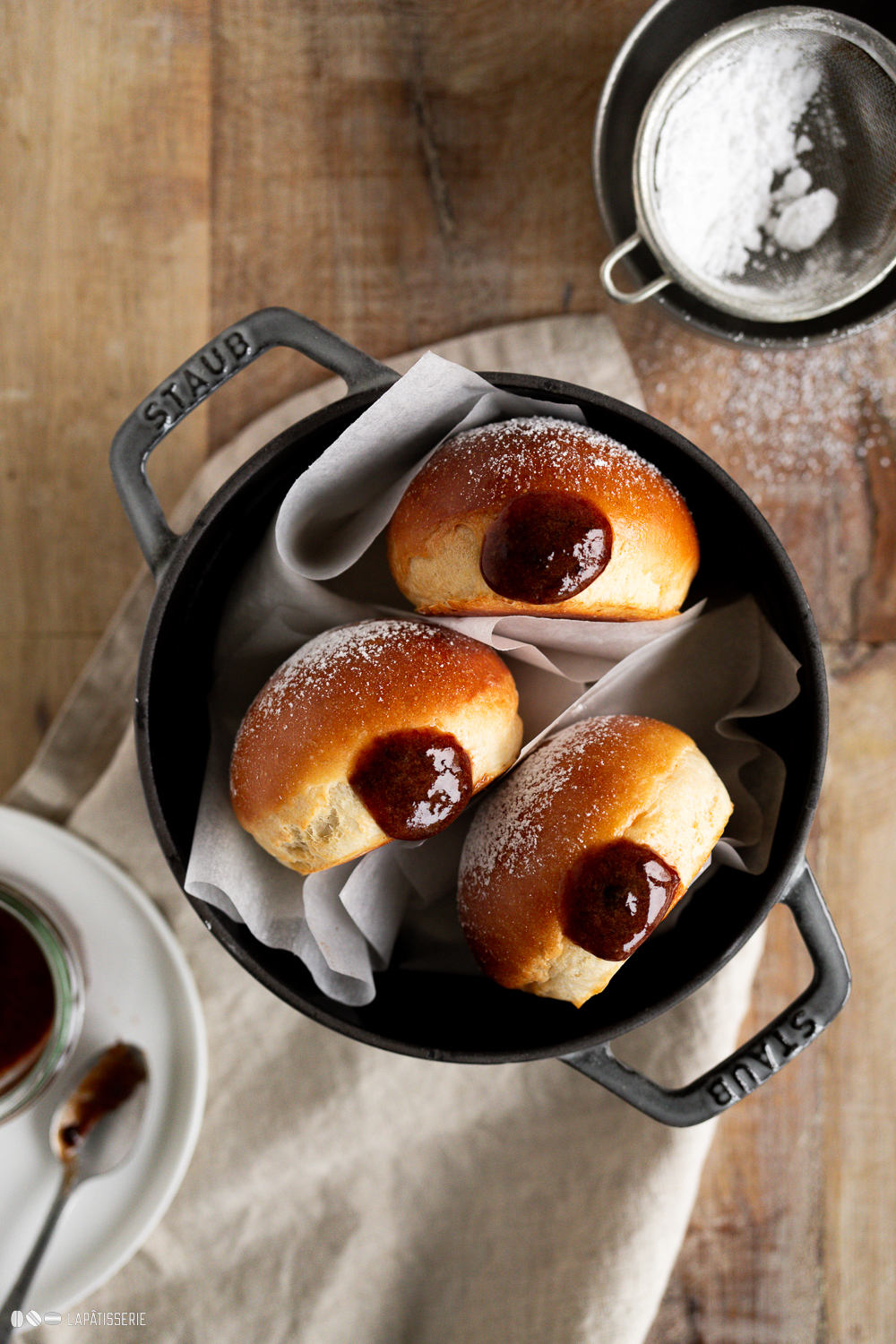 Heute gibt es ein paar leckere Berliner gefüllt mit fruchtigem Pflaumenmus für Karneval, Fasching und überhaupt für jeden Moment des Tages.