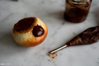 Es war nicht möglich, kleine Teigkugeln daraus zu machen. So habe ich noch etwas Mehl dazu gegeben und noch mal und nochmal. Für diese Menge Mehl würde ich aber doppelt soviel Hefe nehmen. Nun denn, aufgegangen ist der Teig trotzdem. Nach dem Backen fand ich das Ergebnis eher Brötchenartig. Aufgeschnitten und mit