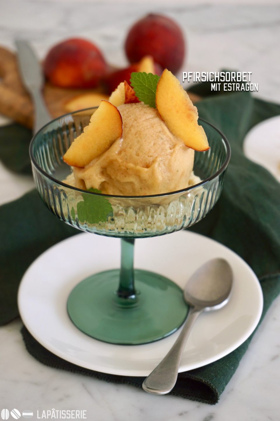 Der Sommer ist noch lange nicht vorbei und damit das so bleibt, gibt es heute ein fruchtiges Pfirsichsorbet mit Estragon.