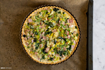 - Den Guss über der Quiche verteilen. Die Quiche bei 170°C (Umluft) für 45 Minuten backen.Die Quiche nach dem Backen für ca. 15 Minuten abkühlen lassen bevor sie angeschnitten wird.