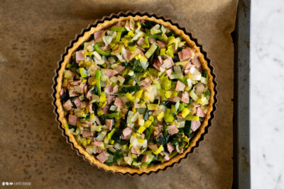 - Die vorbereitete Füllung gleichmäßig auf dem Quicheboden verteilen.
