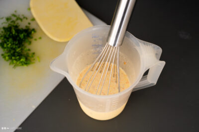 - 150 g Sahne | 50 g Creme fraiche | 0.5 Bund Schnittlauch | 0.5 TL Paprika, rosenscharf | Salz | Pfeffer | 3 Ei (M)Die Zutaten für den Guss in einen Messerbecher wiegen und mit einem Stabmixer pürieren. Den Guss nach Belieben mit Salz und Pfeffer abschmecken.
