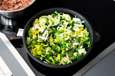 - 1 Gemüsezwiebel | 1 Lauch | etwas SonnenblumenölDie Zwiebeln schälen, halbieren und in kleine Würfel schneiden. Den Lauch waschen und in dünne Scheiben schneiden.In einer Pfanne etwas Öl erhitzen, die Zwiebelwürfel zugeben und anschwitzen.