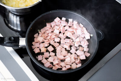 - 200 g Speck (alternativ: Schinken)Den Speck in einer Pfanne scharf anbraten.