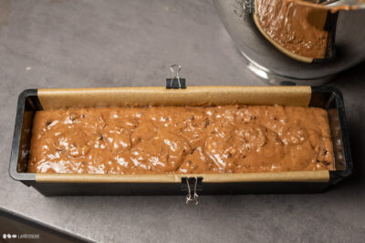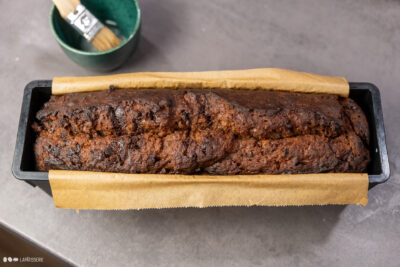 - Teig in eine mit Backpapier ausgelegte Kastenform (30 x 10 cm) füllen und bei 180°C Umluft ca. 50 Min. backen. Abkühlen lassen.