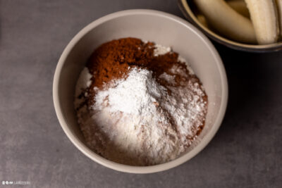 - 330 g Weizenmehl Type 405 | 20 g Kakaopulver | 9 g BackpulverBackofen auf 180°C Umluft vorheizen.Weizenmehl, Kakaopulver und geschrotete Leinsamen in einer Schüssel gründlich vermischen.