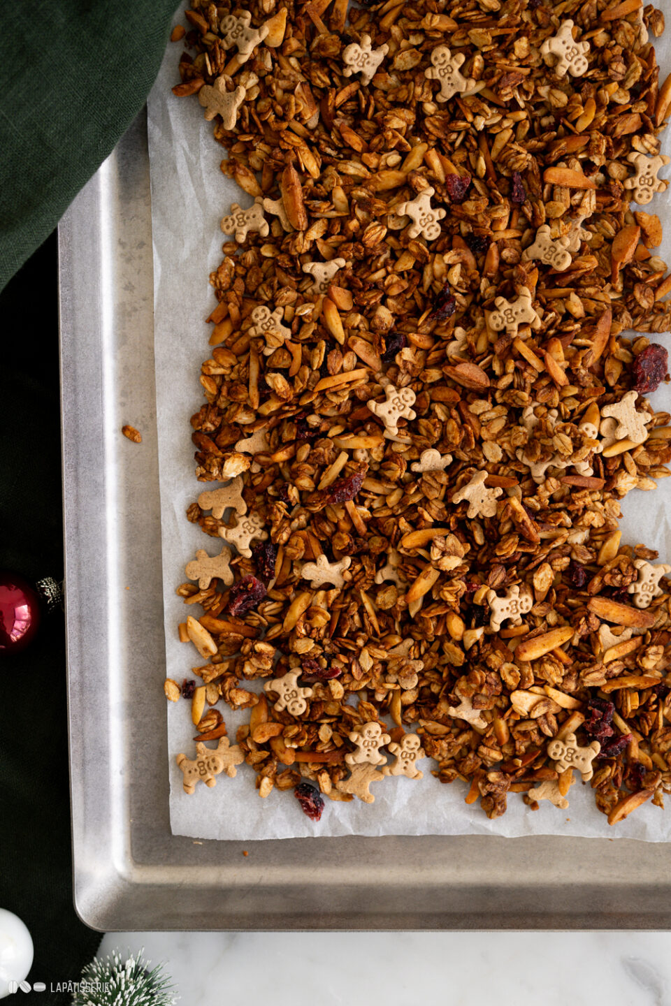 - 50 g Cranberries, getrocknet | 40 g Mini-Kekse, LebkuchenDie Mischung auf das vorbereitete Blech geben und für 10 Minuten im Ofen rösten.Im Anschluss das Granola mit einer Palette oder einem großen Löffel vorsichtig wenden. Das Granola für 10 weitere Minuten im Ofen rösten und erneut wenden. Das Granola ein letztes Mal für 10 Minuten rösten.Das fertige Granola aus dem Backofen nehmen, abkühlen lassen, Cranberries und Mini-Kekse zugeben. In Boxen oder Aufbewahrungsbehältern hält sich das Granola fast unbegrenzte Zeit.